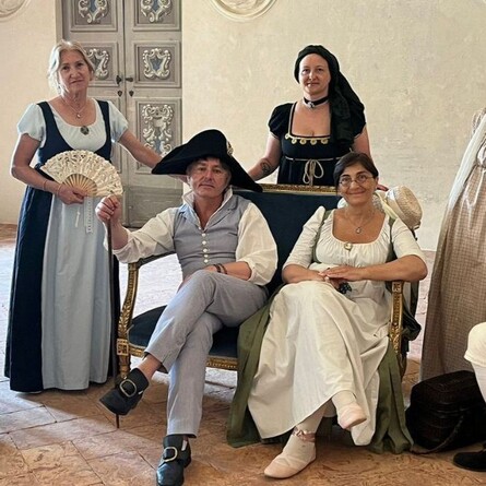 Avvolti in abiti dell’età imperiale — uniformi ricamate, sete leggere, pizzi raffinati — danno corpo e voce a un’epoca sospesa tra la gloria delle conquiste e l’intimità dei salotti, restituendo gesti, riti e consuetudini che segnarono il cuore del primo Ottocento. È un tempo in cui la storia si intreccia con la quotidianità, e ogni oggetto racconta un mondo oggi perduto.